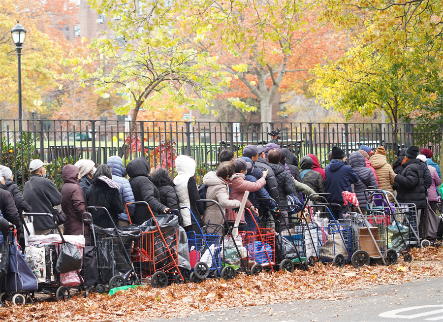 美國(guó)紐約一處食物發(fā)放點(diǎn)人們?cè)陬I(lǐng)取食物
